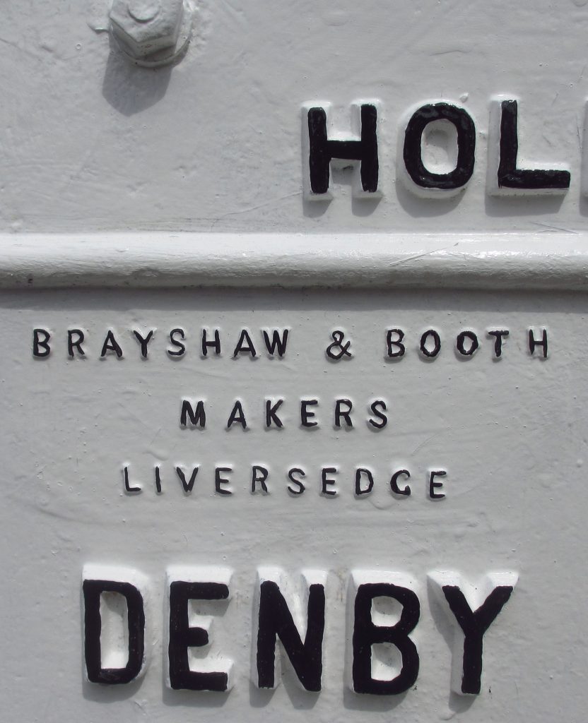 And it would also have been a mammoth task for the firm of Brayshaw and Booth, ironfounders of Liversedge, subcontracted to provide most of the iron plates required.  Their name is displayed prominently on the huge number of their milestones that survive, but little else is known about them: they are listed in trade directories between 1889 and 1917.  Another ironfounder supplying plates was William Towler of Leeds: see separate article.