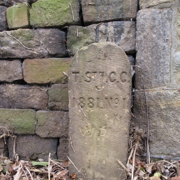 The boundaries of the Thorpe chapelry refer to two boundary stones, both of which still stand. From Kebroyd the boundary reaches “the eastern boundary of the buildings and premises called or known as Dean House and extending thence northward to and along the said wall or fence for a distance of eleven chains or thereabouts to a boundary-stone inscribed ‘T. St. J. C. C. 1881. No. 1’ and placed at the northern end of the same wall or fence on the southern side of Dean-lane”.