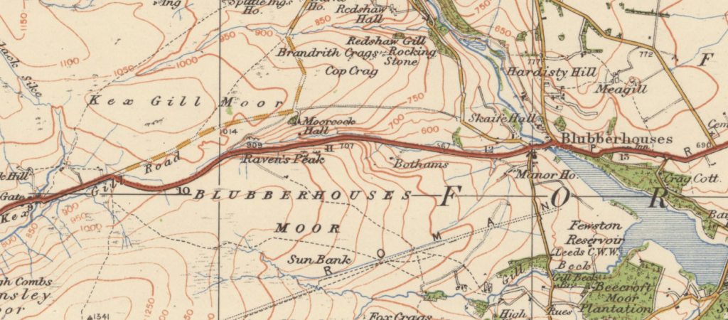 Finally before lunch, Hilary gave a talk on the “Skipton and Knaresborough Turnpike Trust in the 21st century” – a misnomer you might think, but no. Firstly, a run-through of the remaining West Riding Brayshaw & Booth milestones and a couple of survivors from the turnpike era. Then we heard how the turnpike road, the present A59, has suffered from landslips in recent years and is now being partly re-routed north. This is actually onto the original route of the turnpike: in the 1820s, because of the steep gradient leaving Blubberhouses, the Trust built a new section of road lower down, but it is to this old route that part of the A59 is now being diverted. The map below (from the Ordnance Survey 1” map of 1925) shows the two routes clearly. Damaged almost to extinction a decade or so ago, and now sadly inaccessible, is the B&B milestone marking 11 miles to Skipton.